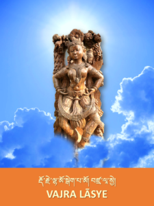 Goddess of Charm, sapphire coloured, (holds vajra and bell at her hips as an) offering of method and wisdom.